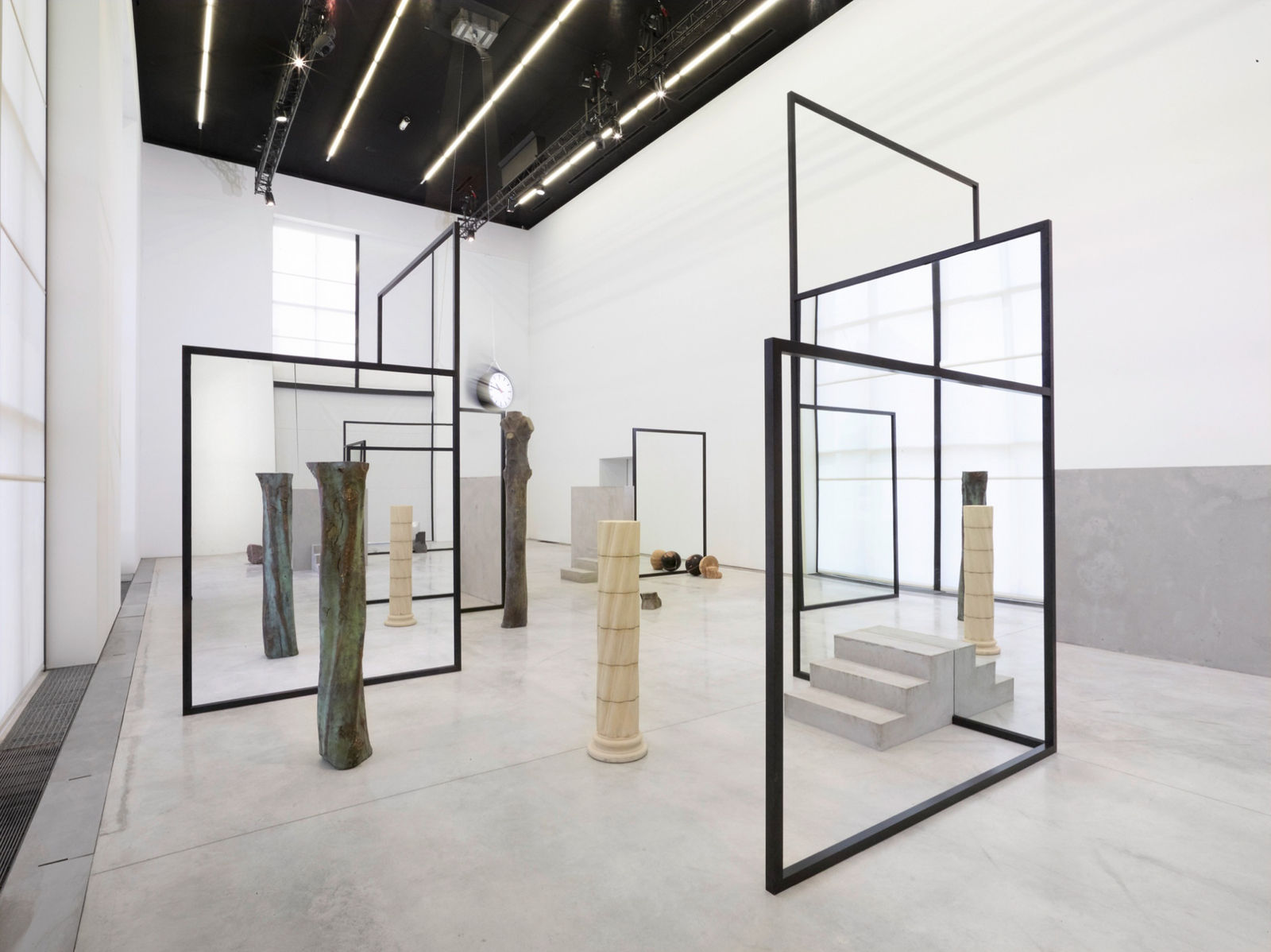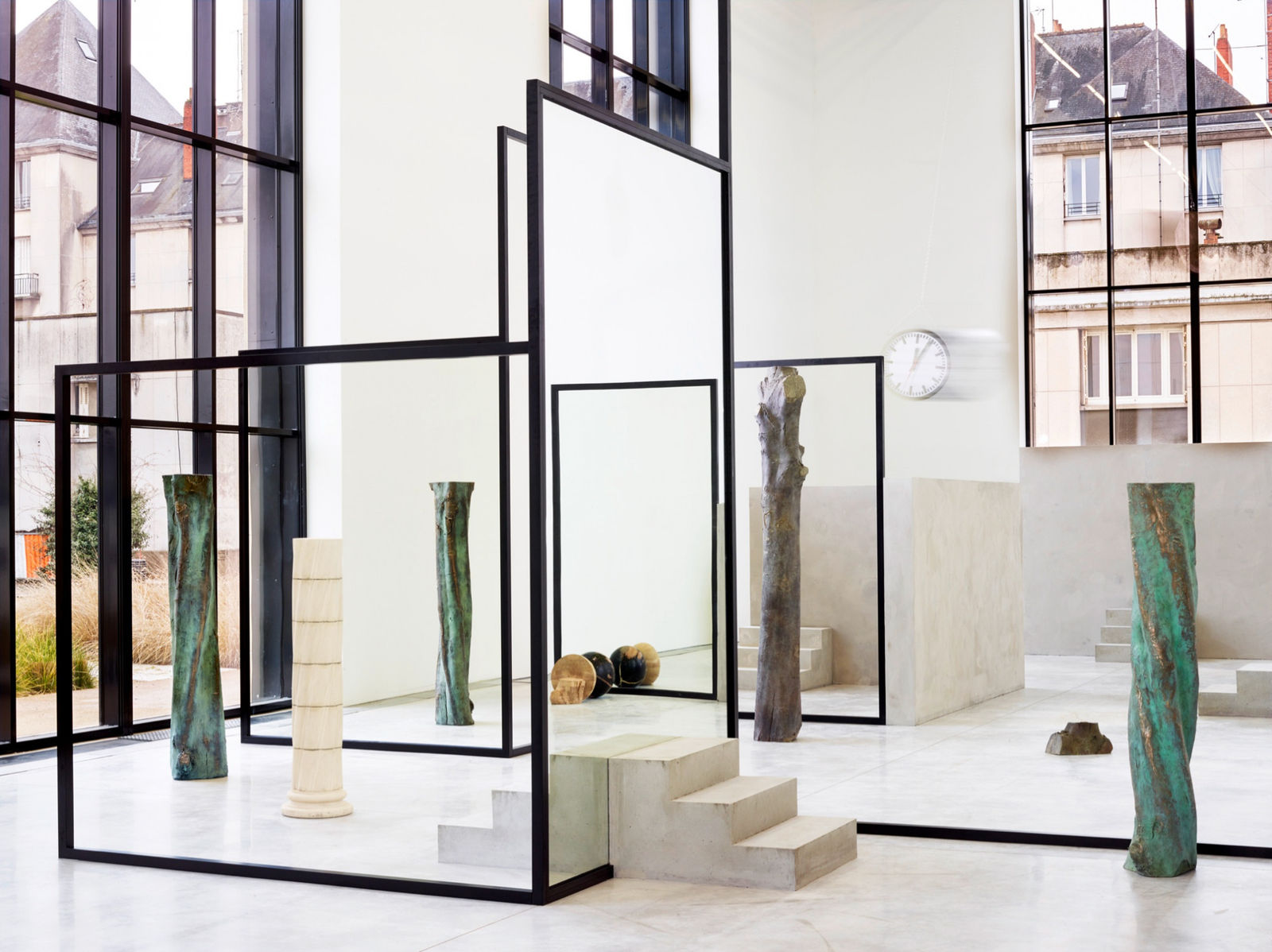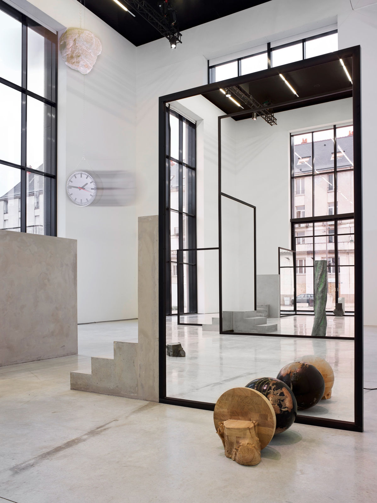 Polish artist Alicja Kwade presents a "The Resting Thought," a monumental new sculptural installation, specifically designed for the Nave of the CCC OD. Through sculptures which probe matter, established value systems, objects and our perception of them, Alicja Kwade's art explores notions of time and space. A labyrinthine structure composed of concrete walls, mirrors, empty metal frames and sculptures, the work invites the spectator to consider the artist's poetic and philosophical questions.