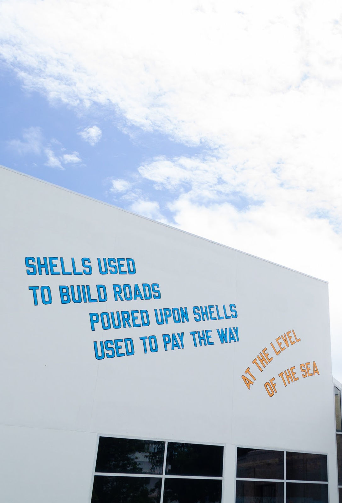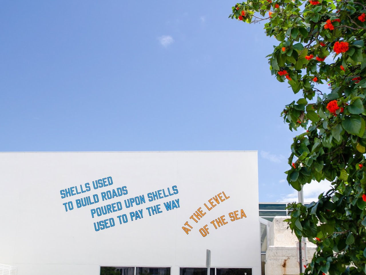 LAWRENCE WEINER's text-based work SHELLS USED TO BUILD ROADS POURED UPON SHELLS USED TO PAY THE WAY, AT THE LEVEL OF THE SEA (2008) can now be seen on The Bass museum’s south-facing wall between Collins and Park Avenue. The work, which references its topography and adjacency to rising sea levels, is part of a collective public art project spearheaded by The Bass to continue to make art accessible while their buildings are closed.