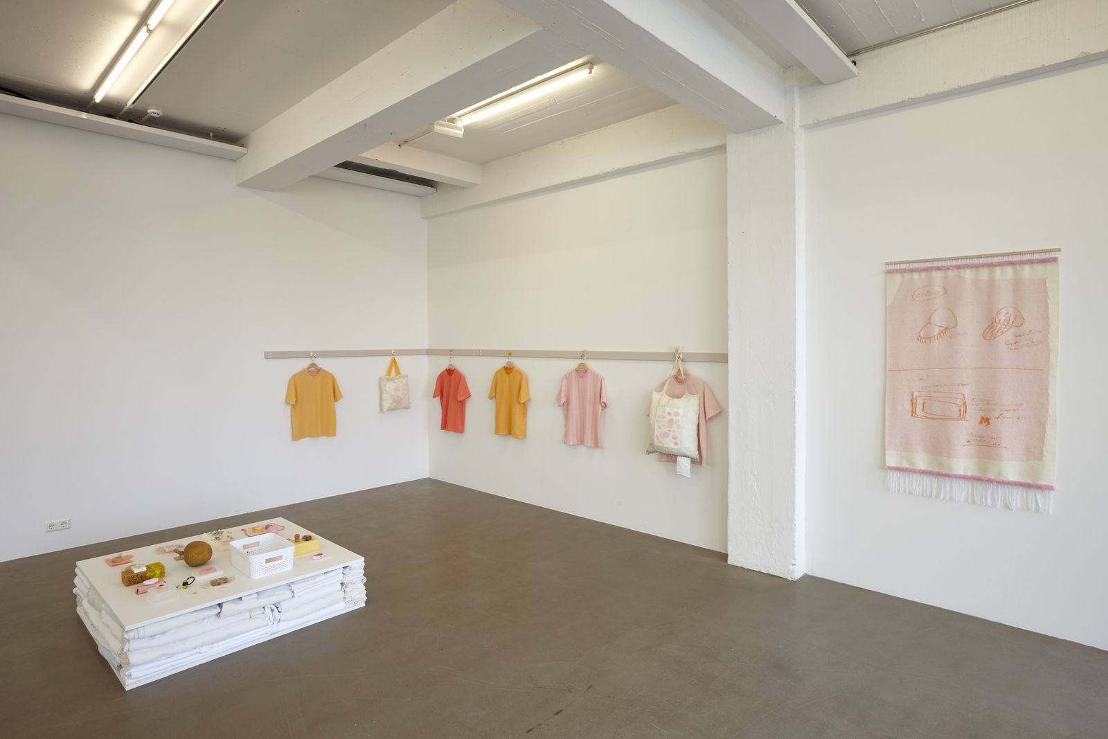 “Coral, salmon pink, hospital pink, crabapple jelly, pale, blush, shrimp cocktail, rose, rosy, dawn, dusk, sweet, sweetheart, sunrise, sunset; Arna colours her words. Soft, hushed tones of pink fade and sharpen on these works, and cultivate warm metaphors throughout the exhibition: rolls of skin, food at fancy parties, tenderness, rawness, insides, outsides, medicine, nostalgia, arousal — all things are tickled pink. Aside from historical reference or connotative gender association, the artist’s choice of colour and materials feels subconscious, arriving out of intuition and feeling. Everything Is Great is a soft palette that offers different shades of meaning.”